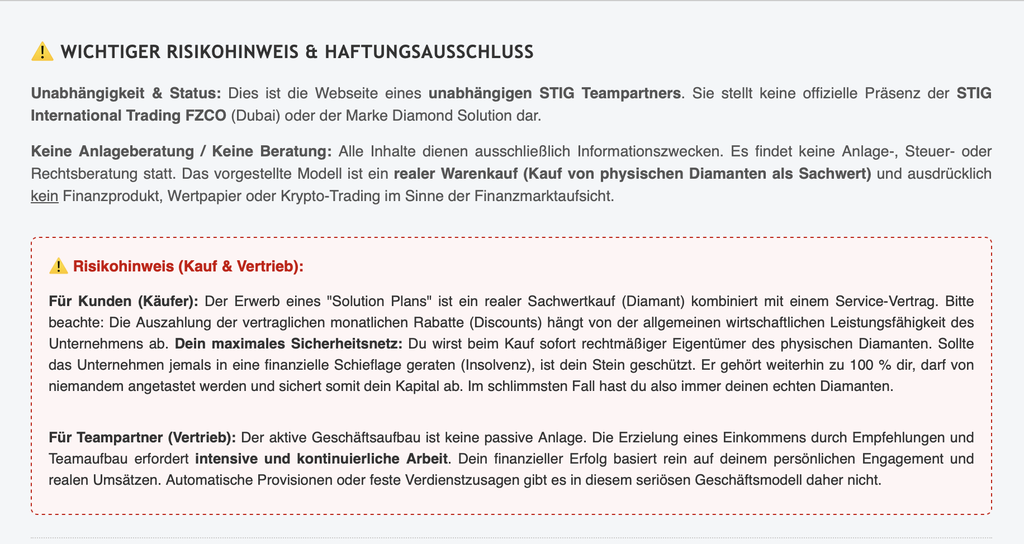 Der Diamanten-Markt ist gigantisch, aber bisher haben nur die etablierten Zwischenhändler daran verdient. Das ändert Diamond Solution STIG International jetzt: Mit einem sogenannten Solution Plan fließen diese üppigen Handelsspannen nicht mehr in fremde Taschen, sondern als monatliche Cash-Rückflüsse direkt zu Ihnen. Es geht dabei nicht darum, Diamanten zu sammeln, sondern die hohen Margen dieses Milliardenmarktes für ein passives Einkommen und/ oder den eigenen Vermögensaufbau zu nutzen.